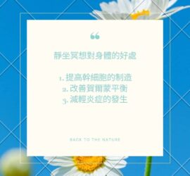 靜坐冥想對身體的好處 1. 提高幹細胞的制造 幹細胞能夠修復系統,維持新生組織的正常轉移,例如血液﹑皮膚或腸組織。 2. 改善賀爾蒙平衡 賀爾蒙影响著人體的新陳代謝﹑器官之間的協調﹑生長發育﹑以及生殖等的調節,亦會影响情緒及睡眠質素。 3. 減輕炎症的發生 發炎是抵抗防禦外來有害因子的反應,是正常現象,也是有益的。 不過,情緒和壓力過多,是會導致身體發炎的,最常見的是皮膚炎症,許多病患的發生都是累積情緒及壓力有關。 靜坐冥想除了是個人成長的活動,對身體健康也是很有幫助的啊! 提供靜心冥想課、療癒圈等活動歡迎查詢或預約WhatsApp / Signal : 65173311 Did you like […]